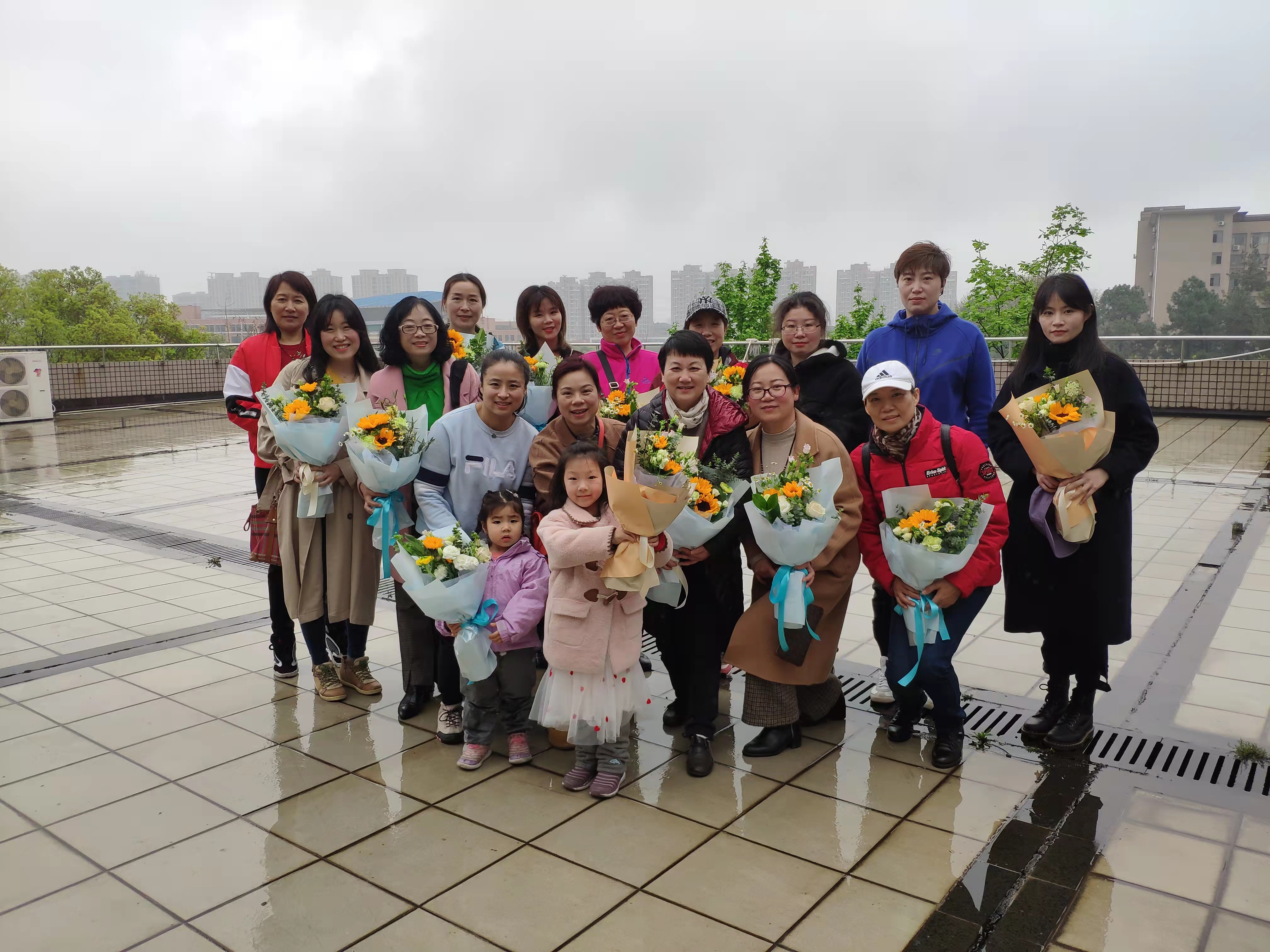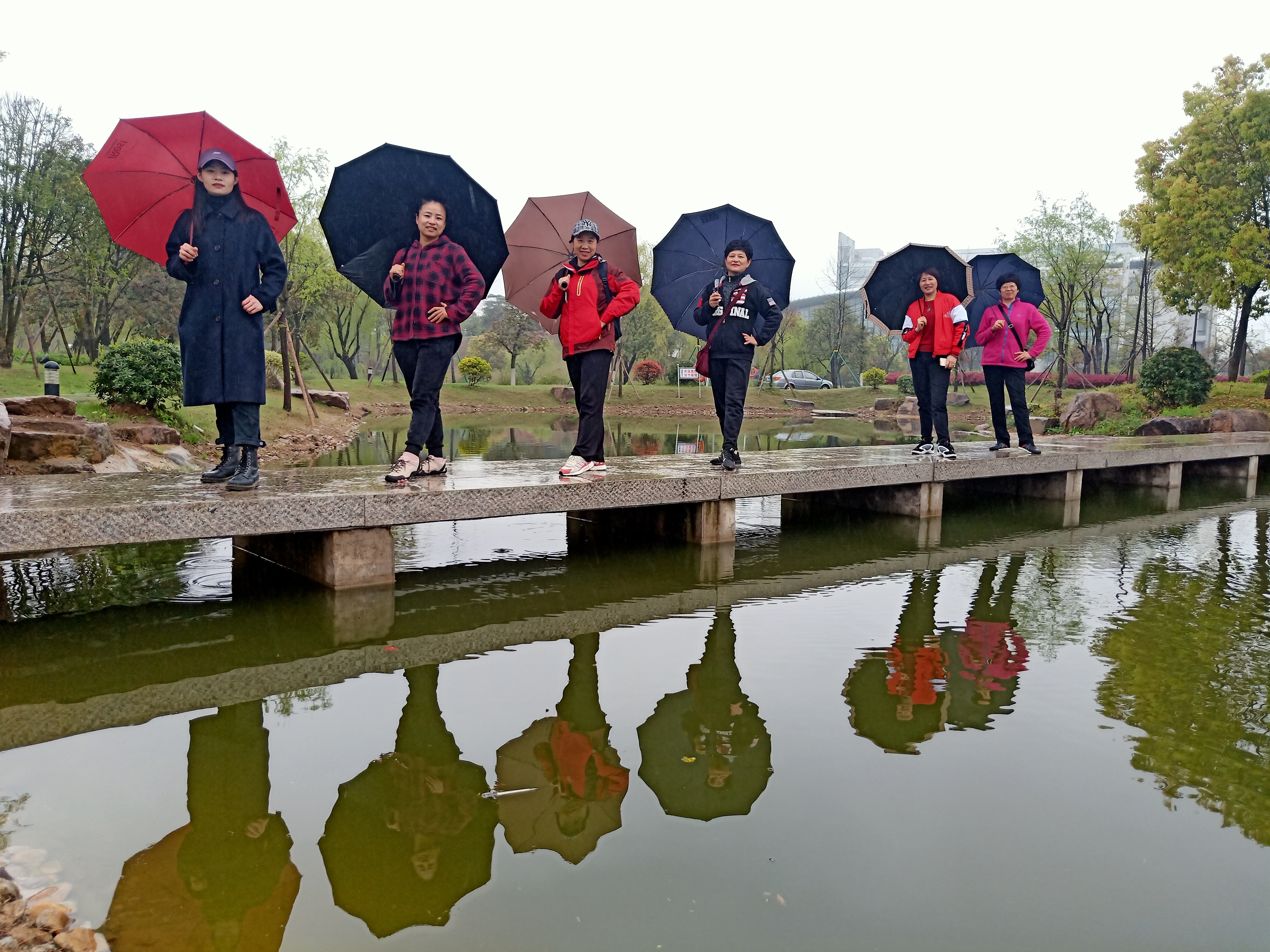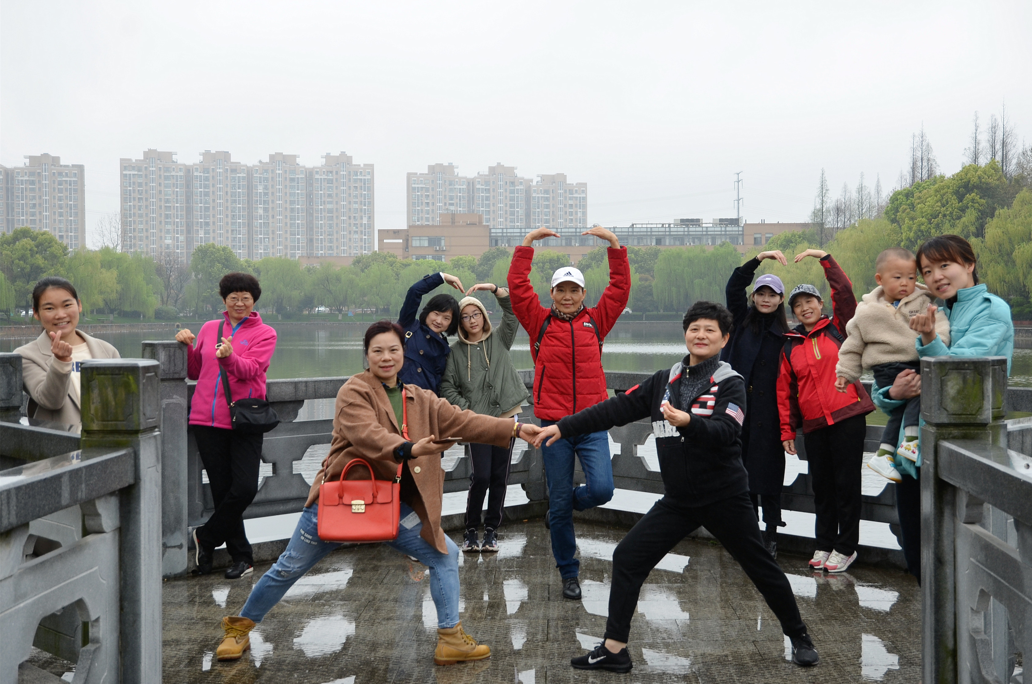 油菜花田,樱花园,骆老师兴致勃勃的亮起了武术造型,英姿飒爽。摄影专业水平颇高的戴老师,忙前忙后,为老师们拍照,单拍、集体合照,忙得不亦乐乎。一张张美丽的照片体现的是体院人雨中互相关照,画面充满了体院大家庭的温馨。到了初阳湖畔,队伍不断壮大,有的老师带着宝宝的前来参加活动。湖中的鱼儿自由地畅游,岸上的老师们欣赏美景,其乐融融。