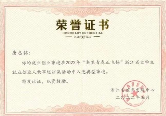 近日,浙江省教育发展中心公布了2022年“浙里青春正飞扬”浙江省大学生就业创业人物事迹征集评选结果,欧冠体育教育192班唐志铭同学荣获“军营大学生战士典型人物”称号。