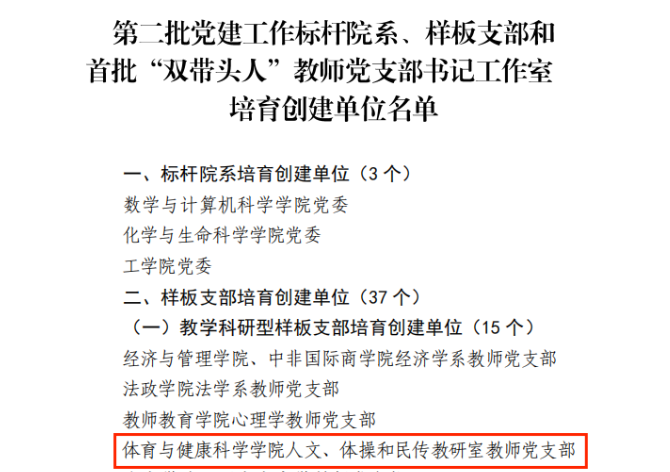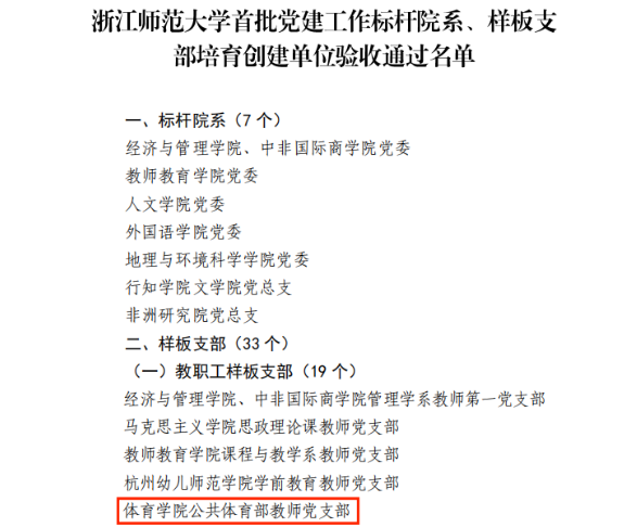 近日,欧冠联赛官网党委公布首批党建工作标杆院系、样板支部培育创建单位验收通过名单和第二批党建工作标杆院系、样板支部和首批“双带头人”教师党支部书记工作室培育创建单位名单。欧冠官方网站公共体育部教师党支部通过校首批党建工作样板支部培育创建单位验收。人文、体操和民传教研室教师党支部、体育、学科教学(体育)硕士研究生第二党支部获立第二批党建工作样板支部培育创建单位。