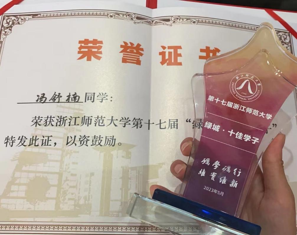 初入师大,身边同学卓越的天资与优秀的成绩使冯舒楠再一次沦为“替补席”的一员。在运动技能方面,她的身体素质弱于队友;在文化学习方面,她的理解接受能力亦不及其他同学。每当她迷茫困惑时,班主任的一句话总是萦绕在她耳畔:没有人生来有天赋,练不好就一直练,学不好就一直学。于是,冯舒楠给自己制定了疯狂的“学业计划”。因为晨练,她感受过浙师冬日里五点半的清冷;因为备赛,她仰望过凌晨三点孔子像的高大。在那三更灯火五更鸡的时光里,每天超出常人的努力坚定了冯舒楠变强的决心。漫长的黑夜终于迎来曙光,仅用两年时间,冯舒楠的学期学分绩点从3.7飞跃到了4.41,并获得了三好学生标兵称号和全院唯一的国家奖学金,完成了她的华丽蜕变。