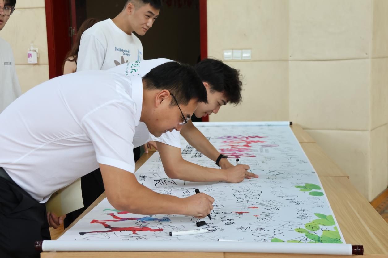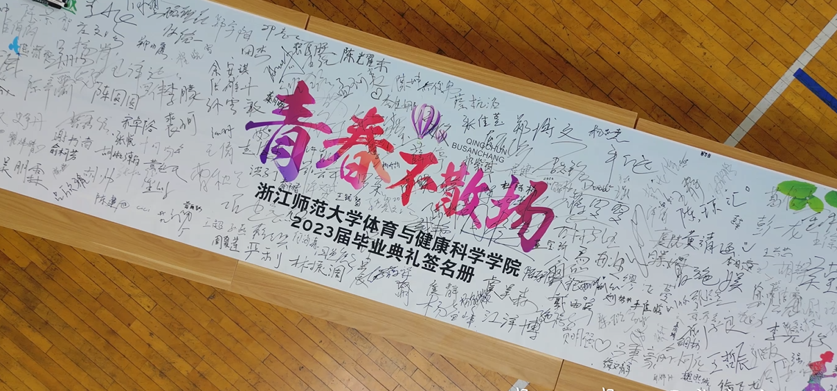 同学们到达典礼现场后,纷纷在印有“青春不散场”字样的毕业典礼签名册上留下了自己的名字,留念这段美好的时光。