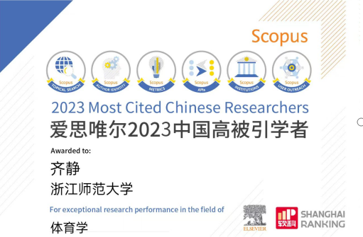 2020年度齐静教授首次入选爱思唯尔中国高被引学者(体育学)榜单,2023年度为再次入选。